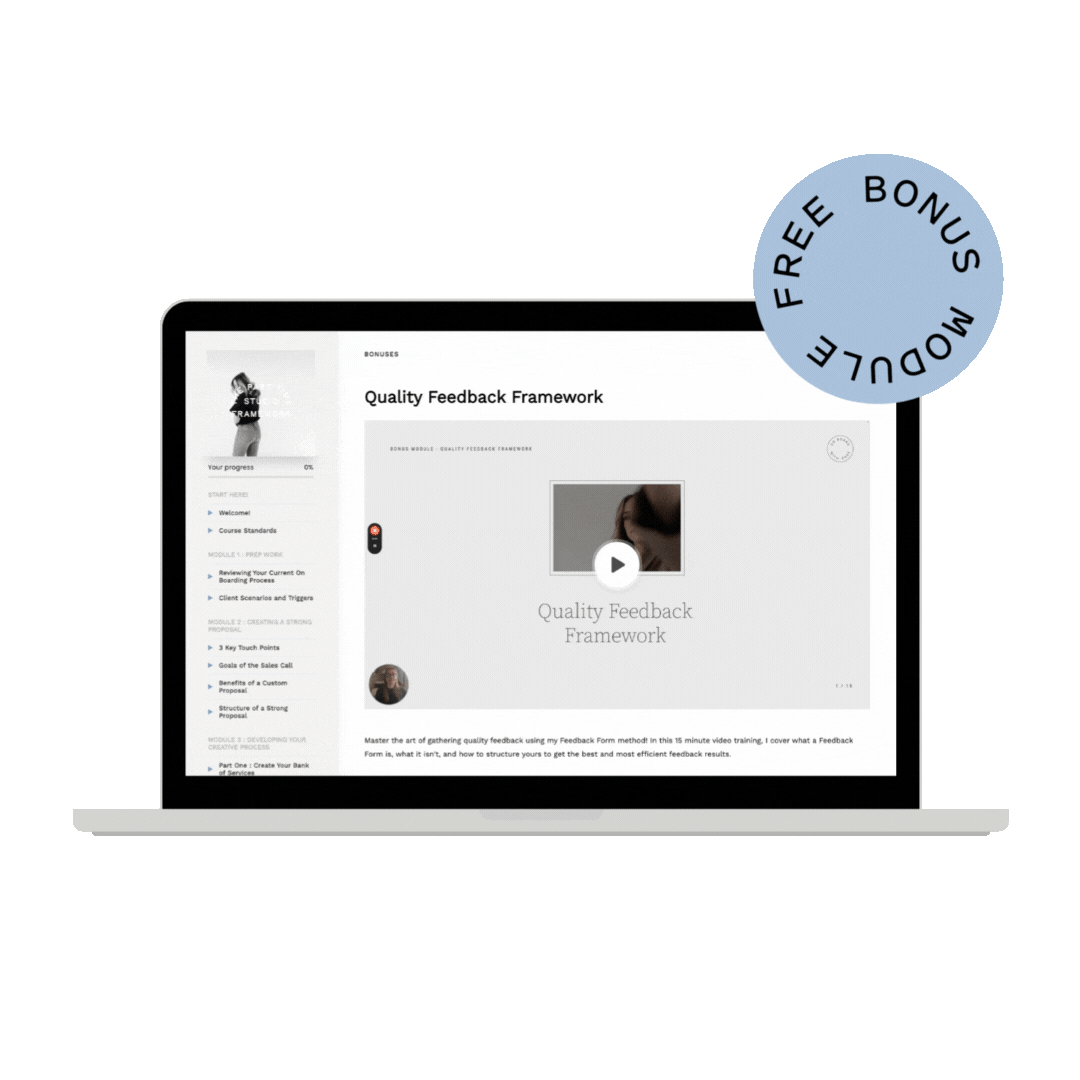 This isn’t just some formulaic course built on algorithms and gimmicks. I have compiled all of my experience building successful client relationships and maximizing my work-life balance so that you can do the same. You’ll be guided through every aspect of the client on boarding process, from initial inquiry to project completion. I also believe in ACTION— I give you the exact steps so that you can implement them into your own process.