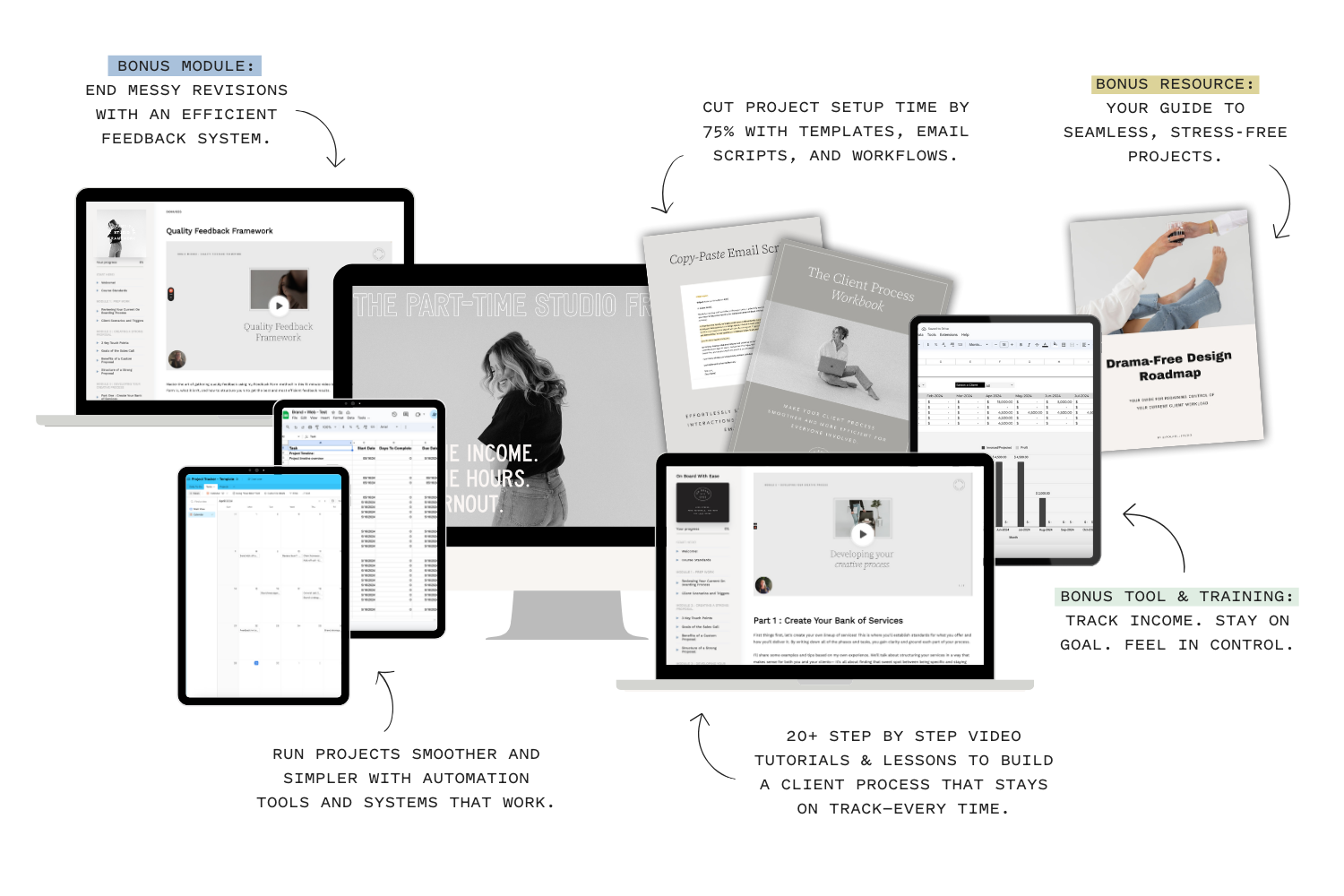 The Part-Time Studio Framework™ goes deeper than just teaching you the steps for a seamless client workflow— it emphasizes how to build and nurture respectful relationships with your clients so you never have to deal with a “nightmare” client situation again.